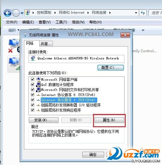 2、在打开的网络属性中,选中【Internet协议版本4(TCP/IPv4)】,然后再点击方面的【属性】,如下图所示。
