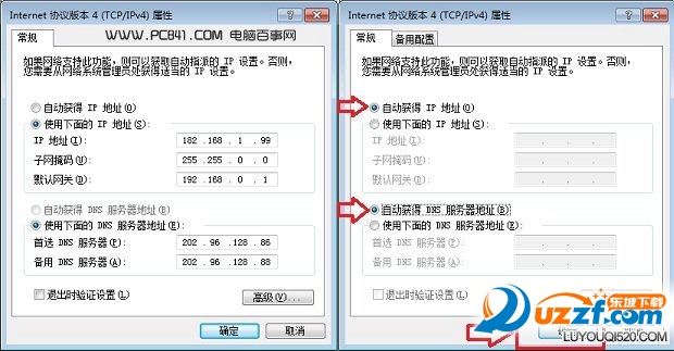 3、如果此前设置过本地IP地址和DNS,这里把它们全部改成为【自动获取】,完成后点击底部的【确定】保存即可,如下图所示。