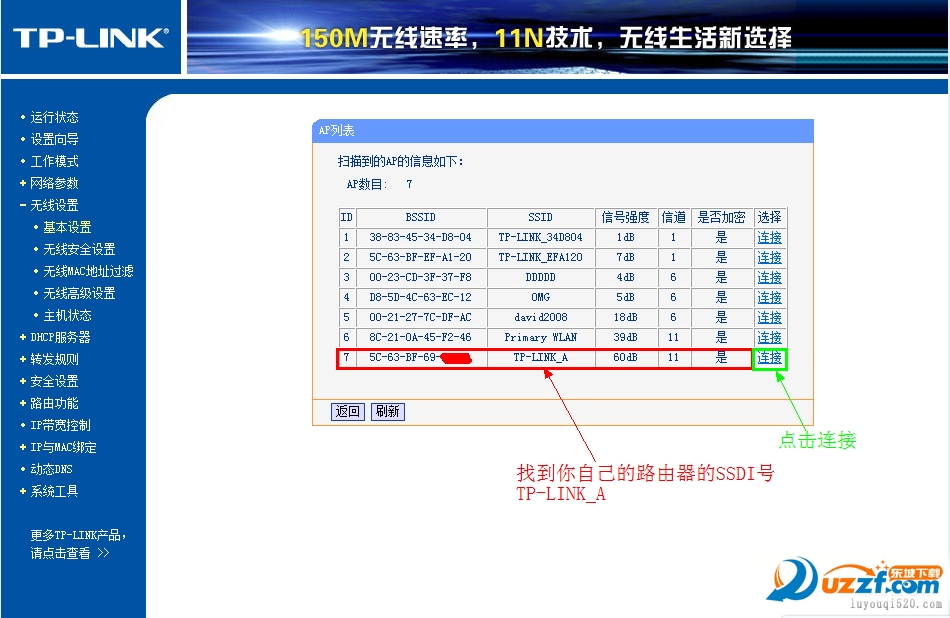 点击「无线设置」->「基本设置」 SSID自己喜欢,但不要与主路由相同,本例以TP_LINK-B为例信道和主路由相同,选11勾选「开启WDS」,在弹出的界面点击扫瞄,得到AP列表以后找到主路由器的SSID,即TP_LINK-A,点击右边的「连接」按钮,会回到先前的界面,加密方式选WPA-PSK,密钥填主路由的密钥:12345678,(保持与主路由器一致即可),保存由于新的WDS功能于老式的Bridge有所不同,更为高级,所以仅需所有副路由器开启WDS并填入主路由的信息即可,如主路由开启WDS或Bridge功能,请关闭,否则WDS功能无法使用!