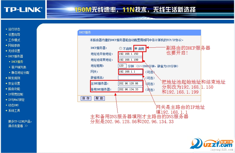 把「地址池起始地址」改为192.168.1.150把「地址池起始地址」改为192.168.1.199只要不和主路由器产生交集即可「网关」填写主路由器的IP地址,即192.168.1.1主和备选DNS服务器填之前写在纸上的地址保存并重启路由器