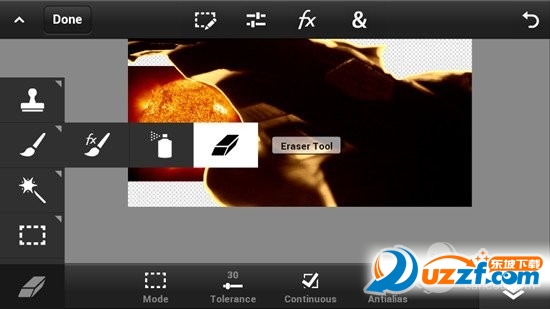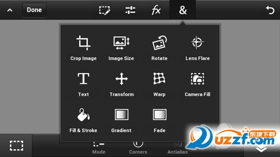 《Photoshop Touch For Phone》的界面整体看起来非常整洁,上下两条黑子白字的工具栏非常清晰,而且按钮也很大,方便用户用手指进行点触操作。此外,上方的工具条可以隐藏,为用户提供了更大的编辑空间。