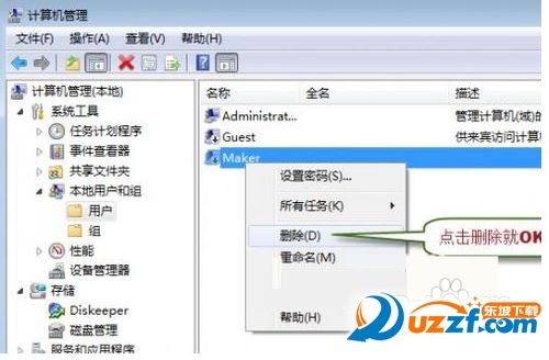 16、① 右键“计算机”,点击“管理”,系统会弹出“计算机管理”界面。在“计算机管理”界面左边窗格在双击“本地用户和组”,再点击“用户”,在“计算机管理”界面中间窗格找到原来的用户帐户(即刚被禁用的用户帐户),右键该用户图标,然后点击“删除”。