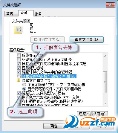 12、① 打开“控制面板”,点击“外观和个性化”,找到并点击“文件夹选项”下方的“显示隐藏的文件和文件夹”,在弹出的“文件夹选项”对话框中,将“隐藏受保护的操作系统文件(推荐)”前面的勾去除,再选上“显示隐藏的文件和文件夹”,点击“确定”使计算机所有文件和文件夹都显示出来。