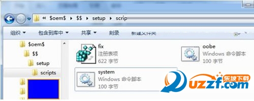 ⑦ 修改封装系统镜像。创建1个名为$oem$的文件夹,在$oem$文件夹内再创建1个名为$$的文件夹,接着又在$$文件夹内继续创建1个名为setup 的文件夹,最后在setup的文件夹内创建1个名为scripts的文件夹($oem$文件夹最终的目录结构 为:$oem$$$setupscripts)。然后将保存的注册表文件(fix.reg)和oobe.cmd、system.cmd复制 到$oem$$$setupscripts目录下。
