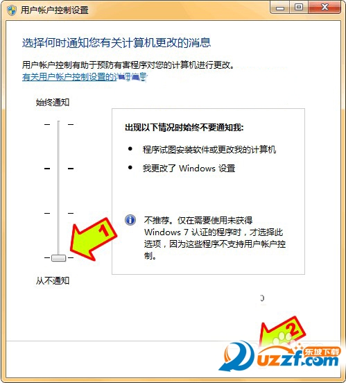 ④ 为避免调整优化系统、安装应用软件过程中出现不必要的错误和产生错误报告文件,第一次进入系统后应当禁用UAC和关闭错误报告。禁用UAC和关闭错误报告的方法如下:打开“控制面板”,点击“系统和安全”,选择“操作中心”,点击“安全”,在展开的详细设置内容中找到并点击“用户帐户控制”下方的“选择您UAC级别”,然后在弹出的对话框中将左边的滑杆调整为“从不通知”,再点击“确定”就可以禁用UAC了(需要重新启动系统才能生效)。