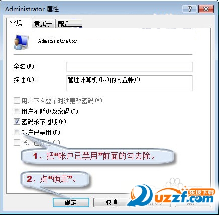 9、② 右键Administrator用户图标,点击“属性”,在弹出的Administrator属性对话框内把“帐户已禁用”前面勾去除,再点“确定”就可以启用Administrator用户帐户了。