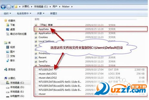 14、③ 将刚被禁用用户帐户的文件夹(Maker)里面的“AppData”文件夹和NTUSER.DAT、 ntuser.dat.LOG1 、 ntuser.dat.LOG2 、 NTUSER.DAT{xxxxxxxx-xxxx-xxxx-xxxx-xxxxxxxxxxxx}.TM.blf、 NTUSER.DAT{xxxxxxxx-xxxx-xxxx-xxxx- xxxxxxxxxxxx}.TMContainer00000000000000000001.regtrans-ms、 NTUSER.DAT{xxxxxxxx-xxxx-xxxx-xxxx-xxxxxxxxxxxx}.TMContainer00000000000000000002.regtrans-ms 、 ntuser.ini(如果有SciTE.sessio、全局缩写.properties这2个文件的话,也要选上)复制到默认用户的文件夹(C:UsersDefault)内,复制过程中如果提示有文件或文件夹同名则点击“确定”覆盖或合并即可。