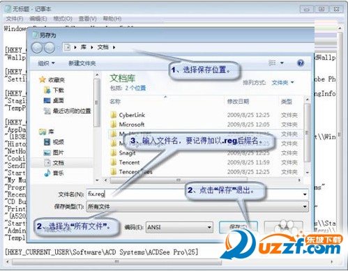 ⑤ 保存注册表文件。在记事本菜单栏点击“文件”,再点击“另存为”,在弹出“另存为”对话框中选择要保存的位置,在“保存类型”选择“所有文件”,在“文件名”输入文件名(一定要记得加上reg后缀名),最后点“保存”退出记事本。