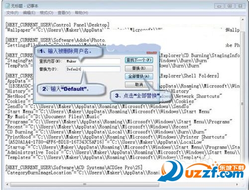 ④ 替换注册表项目。在记事本菜单栏点击“编辑”,再点击“替换”,在弹出对话框内的“查找内容”输入已经删除的用户名,在“替换为”输入“Default”,然后点击“全部替换”。