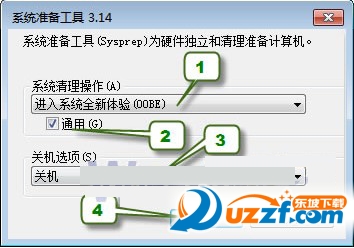 20、① 打开“计算机”,在C:WindowsSystem32sysprep目录下,找到并运行sysprep.exe,在“系统清理操作”下方选择“进入系统全新体验(OOBE)”,并把“通用”选上,然后在“关机选项”选择“关机”,再点击“确定”开始执行封装。
