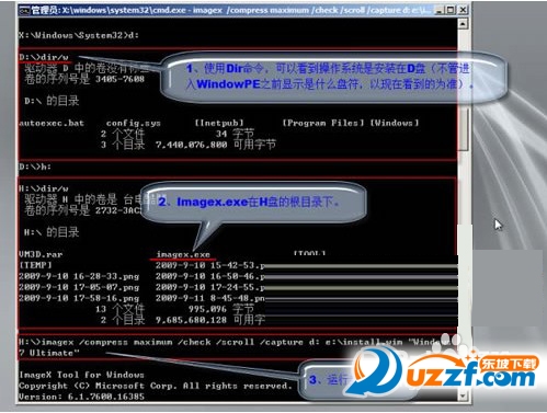 ② 用WindowsPE光盘(最好是Windows7PE)启动计算机进入WindowsPE系统,插入带有Imagex.exe的U盘,通过Dir命令查找操作系统和Imagex.exe所在分区,系统切换到Imagex.exe所在目录,运行以下命令制作封装系统镜像: