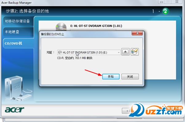 4, CD/DVD机:可以将文件备份到空白的CD或是DVD光盘上,选择CD/DVD机(1),选中刻录机(2),当未插入可刻录的光盘的时候将提示未插入光盘。