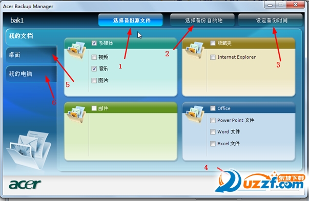 第一步:选择"备份源文件",源文件可以选择3种位置。我的文档,桌面,我的电脑