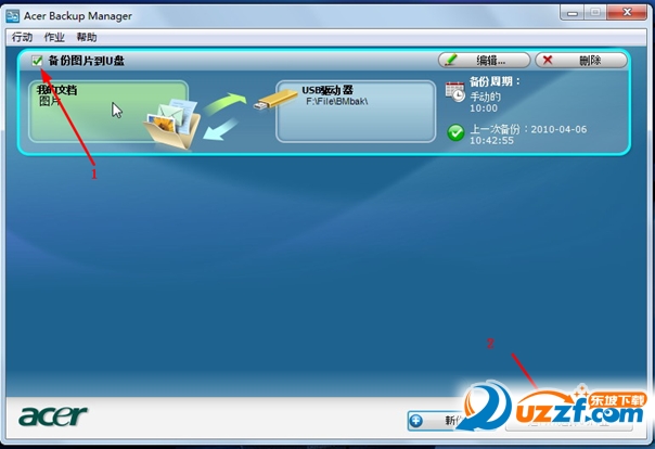 在下一次使用中可以按Acer Backup Manager按钮来启动,会自动运行点了"一键备份"的备份作业,也可以点击暂停来停止(1),暂停后可以点击"主程序"(2)新建或是修改之前之前设定的作业