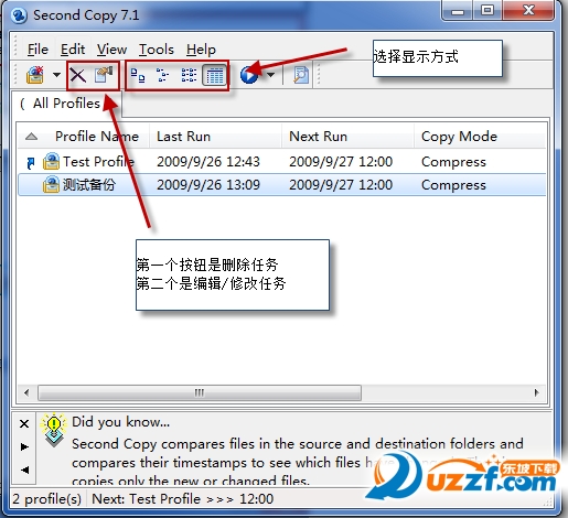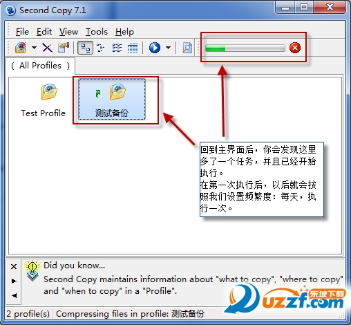 Second copy是一个文件备份软件,它会常驻在系统托盘,你可设定每隔几分钟(或是几小时、几天)自动执行一次备份工作,它会依你指定的时间间隔在后台作业,自动帮你 将重要的文件或是整个文件夹备份到指定的目录。除了进行简单的复制,程序还可以将要备份的文件压缩到 Zip 文件,以及使源文件夹和目标文件夹保持同步。借助向导的帮助,你可以很快很容易地完成方案文件的设置和更改。