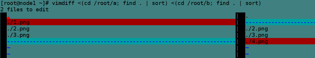 [root@node1 ~]# (cd /root/a;find . | sort >/tmp/file1) [root@node1 ~]# (cd /root/b;find . | sort | diff /tmp/file1 -)2d1 < ./1.png4a4 > ./4.png