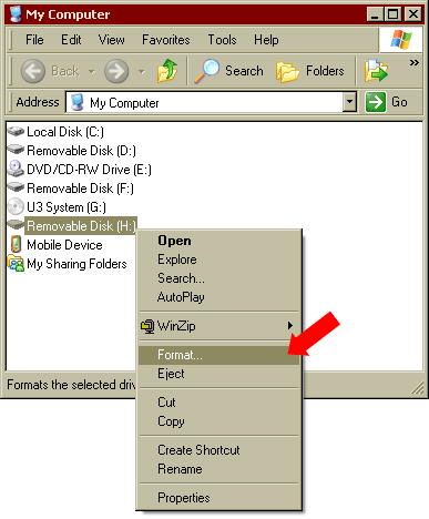 2.右击您记忆卡的可移动磁盘, 然后选择格式化。