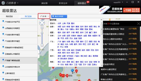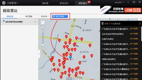 6、身边找不到合适的影视资源?不用怕,百度影音还有一个插电找电影功能,在地图上任意一处插上一个小标记,百度影音超级雷达功能会自动为你查看该地区附近的视频资源。至于能不能找到好资源,看人品吧!