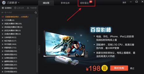 1、首先安装好百度影音后,打开软件主界面就可以看到大大的“超级雷达”字样。