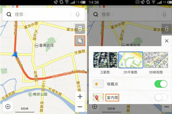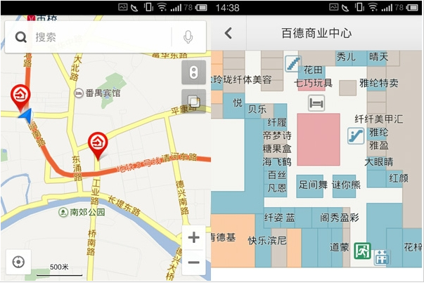 打开“室内图”功能后,在地图上就会出现“房子图案”的标志,点击标志我们就能看到商场的室内图了,如果你在商场里面,还可以实现室内定位。至于室内定位是否准确,就等待大家体验了。