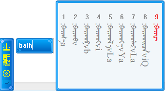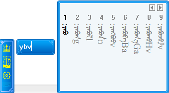 输入字母后候选框中显示的黑体词是和输入码所匹配的蒙古文词,而灰色词是部分匹配词。如图2-3所示。用户可依据灰色词下面的输入码提示继续输入,最多显示随后的三个字母,其中大写字母是下一个音节首字母,用户可直接输入大写字母快速录入下一个音节,例如用户要继续录入yabvba时,在ybv基础上直接输b,即可。