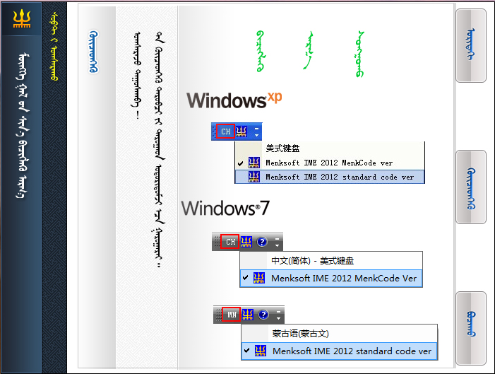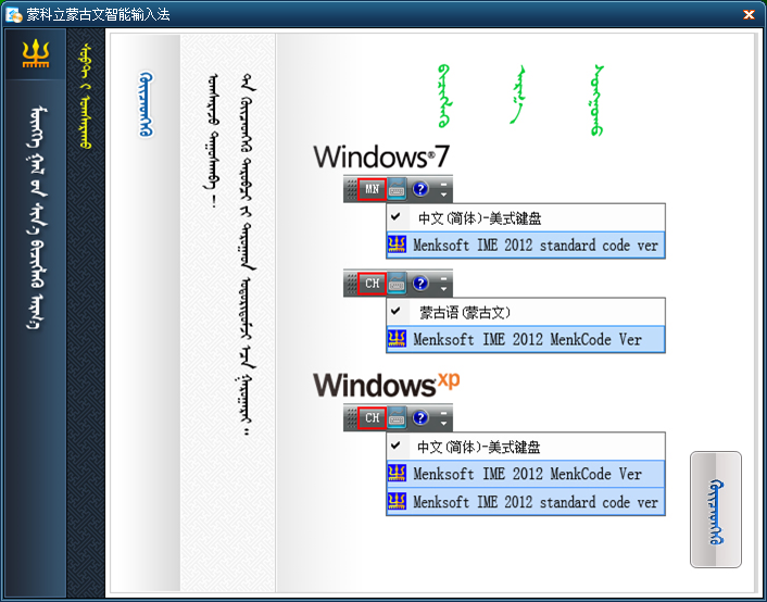 将输入法分为蒙科立编码版(放入CH语言栏中)和标准编码版(xp中放入CH语言栏中,vista及以上版本中放入MN语言栏中)。如图1-9所示。