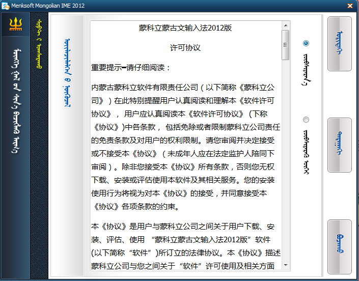 蒙科立输入法安装协议,若用户接受我公司的安装协议选择“我接受许可协议中条款”,单击