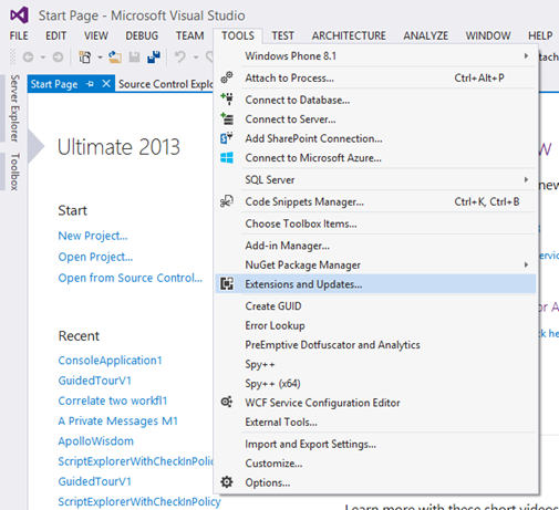 1. 打开Visual Studio, 在工具菜单中选择“扩展和更新”