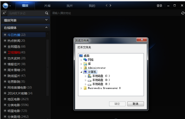 5、选择打开文件夹,会弹出浏览文件夹,你可以打开本地保存的视频文件。