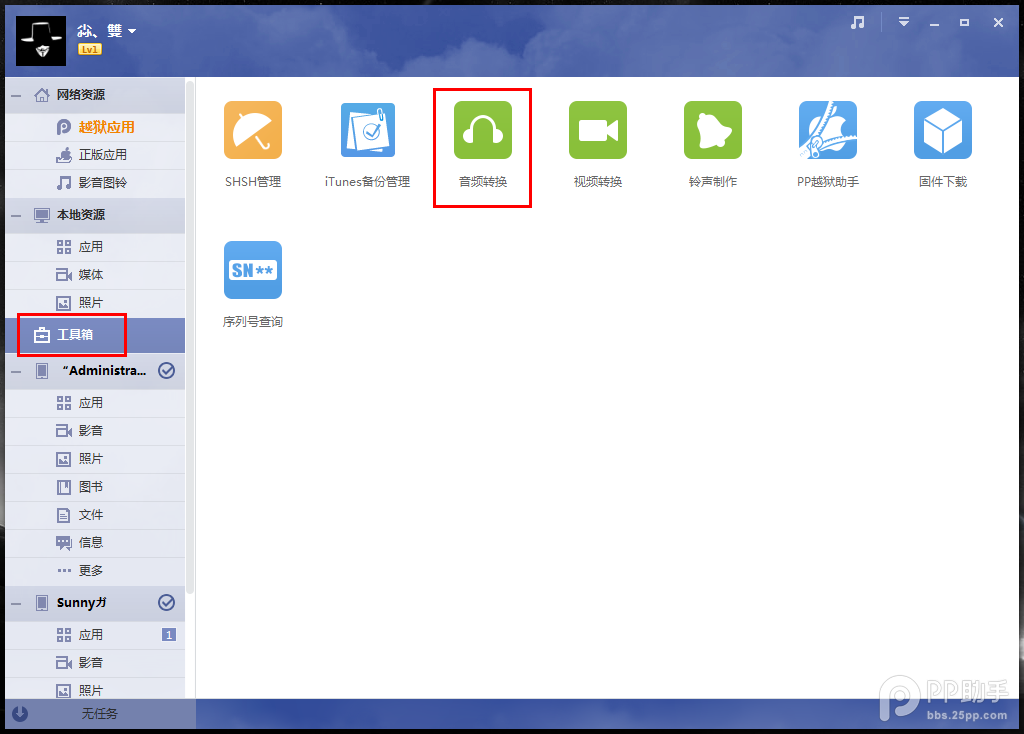 1、首先打开PP助手,打开【工具箱】 —> 【音频转换】 :