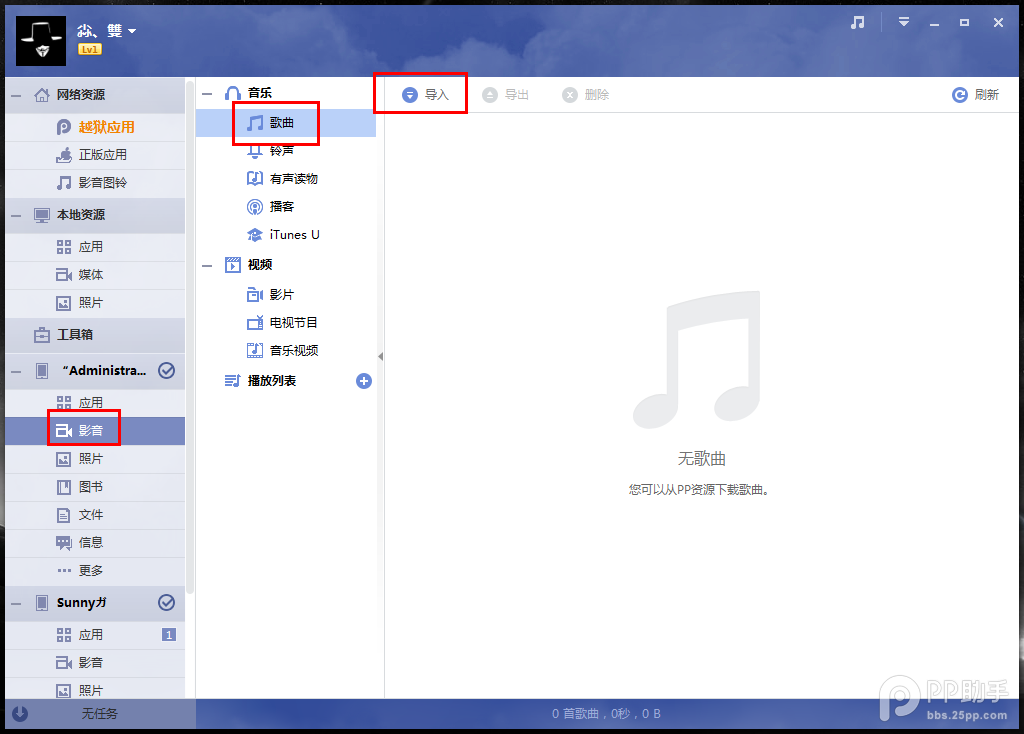 5、进入设备栏点击【影音】—>【歌曲】】—>【导入】: