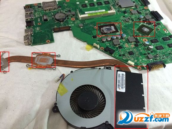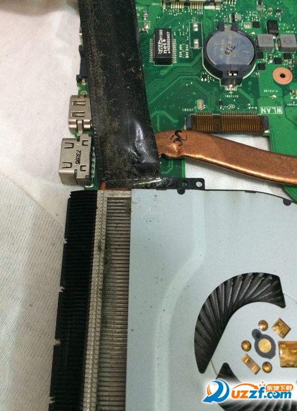 将主板及铜管上的旧硅脂用塑料铲子铲除,把风扇上黑色的胶带撕开,建议撕的时候用吹风机热风加热一下,方便拆除;拆下来之后就是清灰了加硅脂了,切记硅脂不可多加,适量即可。