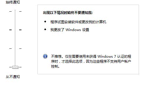 2、把拉杆拉到最下面的一格,关闭系统中的UAC
