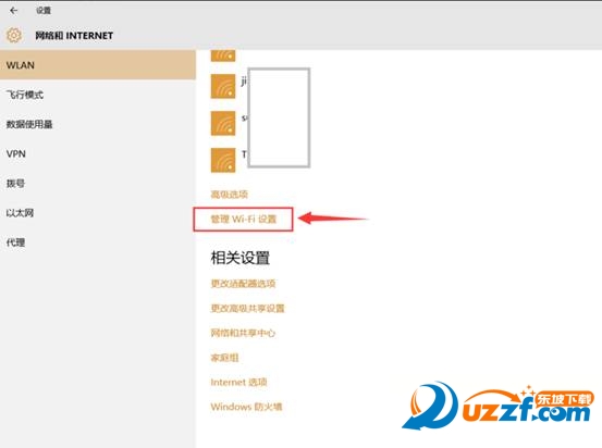打开的网络和Internet选项中选中WLAN选项,里面有个“管理Wi-Fi设置”,点击它;