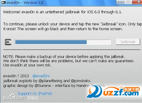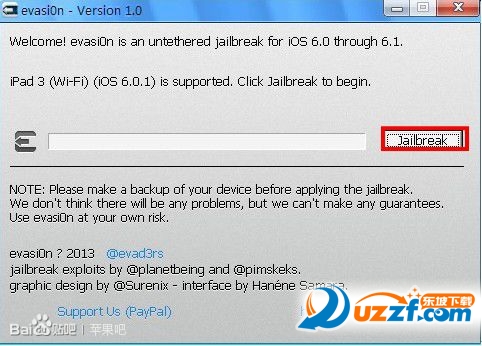 ⑴打开刚下载好的evasi0n,点击Jailbreak开始越狱