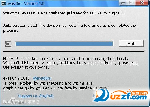 ⑵出现这个界面后,你的设备上会出现evasi0n的icon,点击它,记住,只需点击一次,Only tap it once。