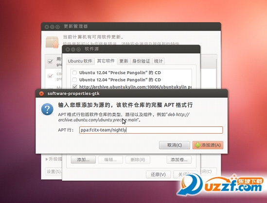 2. 在更新管理器中,选择菜单:编辑->软件源,点击添加...按钮,在弹出的窗口中输入ppa:fcitx-team/nightly,