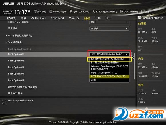 重启系统进入主板BIOS设置,如果主板支持UEFI,光驱里有光盘,启动项里会有UEFI光驱启动项,设置第一启动项为UEFI光驱。