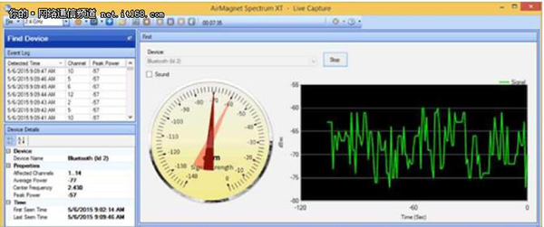 发现非 Wi-Fi 干扰后, 可以利用 Spectrum XT 找到干扰设备的位置。 在 Spectrum XT 启动屏幕中, 双击左下方区域中显示的任何干扰源,以启动“查找”工具。 进入“查找”工具后, 单击“开始”, 激活显示干扰源接收信号强度的仪表。 启动“查找”工具后, 可以拿着运行 Spectrum XT的设备四处走动, 对干扰源进行跟踪。