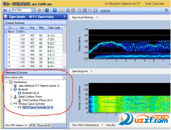Spectrum XT 在默认启动屏幕的左下方区域显示了一个干扰源列表。 前往 Spectrum XT 底部窗格并选择“频谱图 -> 干扰源”可以查看更多信息(包括干扰信号所使用的通道以及干扰源接收信号强度指示器(RSSI)的强度)。 此时会显示相同的干扰源列表, 但提供了更多的详情。