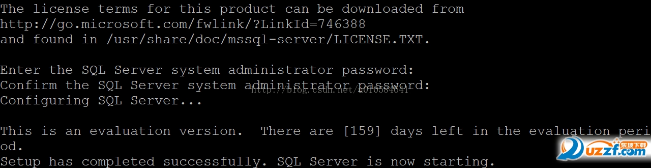 注意在这里确认完密码后,我这里提示是安装失败的,原因是mssql for linux 的使用微软默认添加了内存的限制,是3250M,也就是服务器至少是3.5G内存,而我的服务器只有2G,没有达到最低要求,微软可能是出于性能考虑吧,当然正式的生产环境也不可能内存只有这么一点点,但对于我们平时想要自己玩儿的人,却成了困扰,但要相信总有解决办法的,我会在另一篇博客中写怎么去破解这个限制,大家也可以看这里破解SQLServer for Linux预览版的3.5GB内存限制 (RHEL篇),别人的一篇博客,我也是学习别人的,但是还是会写一下,因为可能很多人看蒙了。另外还有一点,安装完后,提示剩余160 days,看来这个mssql for linux是要收费的。下面我们来启动sql 服务