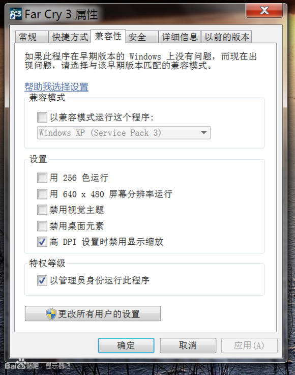 还有一个问题,如果设置完后发现有的游戏或软件显示不正常怎么办?没关系,这时你需要对软件的exe或者快捷方式点击右键-属性-兼容性,把高DPI设置时禁用显示缩放打上勾然后确定,再运行就能正常了。