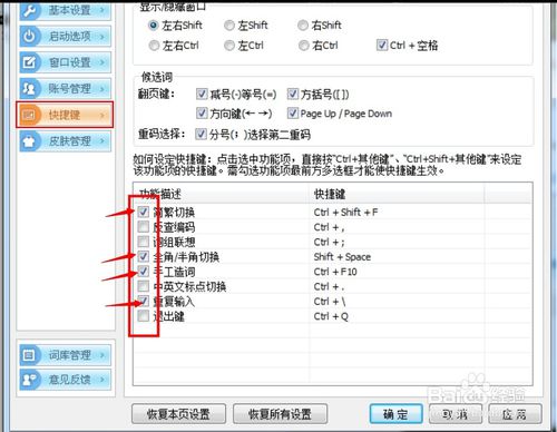 3、出现弹出窗口,如图所示,快捷键中有几个打了勾,红颜色标示部分;