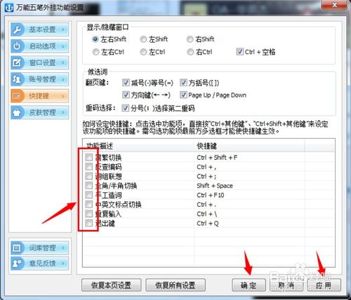 4、去掉打勾的地方,分别点击{应用、确定},这要就去掉万能五笔的快捷键了