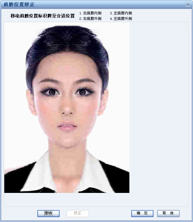 第三步:移动肩膀位置标识牌至合适位置,然后点击“矫正”按钮来矫正肩膀位置。在调整肩膀高低的时候,主要是移动标识牌2的右肩膀外侧和标识牌4的左肩膀外侧,上下移动到合适位置点击“矫正”,如果一次没有矫正平衡,点击“撤销”再次调整标识牌位置,直到矫正到照片左右肩膀平衡。
