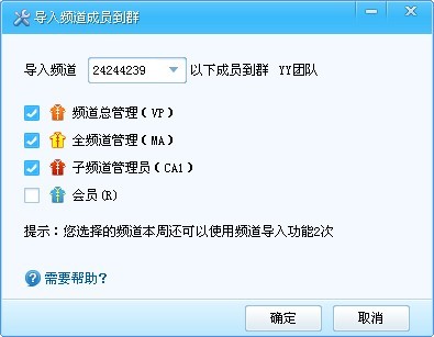 下拉框中提供了所有你是OW的频道,选择一个你想导入的频道。可以勾选导入频道总管理(橙马)、全频道管理(黄马)、子频道管理(红马)以及会员(蓝马)。