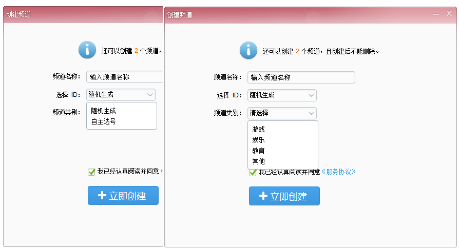 输入频道名称,并选择频道ID和类型即可创建频道。频道ID选择可随机生成或自主选号,频道类别填写正确将有助于频道曝光和宣传。
