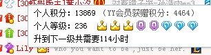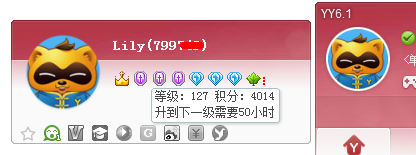 鼠标移入频道树内等级图标可查看自己和YY好友的具体等级、积分情况。