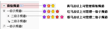 粉红色头像:二级子频道管理员(CA2)二级子频道的管理,可以设置二级子频道信息对二级子频道进行管理