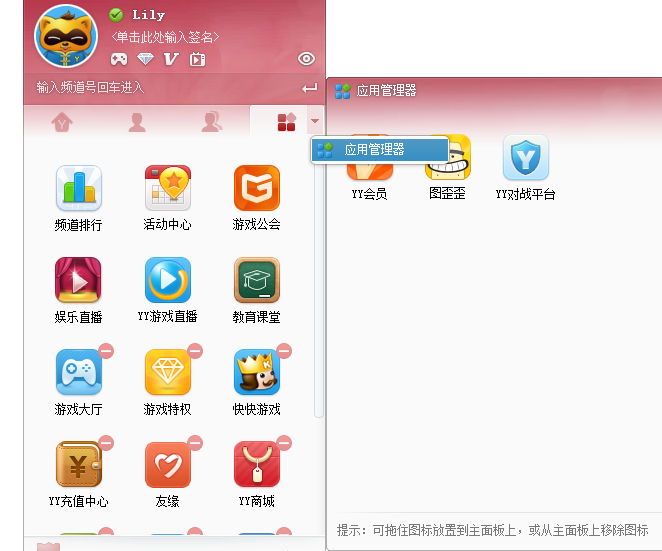 主面板内汇集了大量YY应用,为丰富YY世界增添了更多色彩。在TAB区的YY应用,鼠标移入即显示“应用管理器”,点击打开即可拖动或点击加号添加、点击减号删除主面板内的应用。